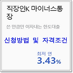 케이뱅크 직장인K 마이너스통장 자격조건 및 신청방법 케이뱅크 대출 상품인 직장인K 마이너스통장 신청방법 및 자격 조건에 대해서 알아보도록 하겠습니다. 상품안내 및 자격조건 상품종류는 가계 신용대출입니다. 대출대상은 동일기업 6개월 이상 재직 중이고, 연 환산소득 2천만원 이상인 근로소득자, 국민건강보험 또는 국민연금 가입 개인고객, 외부 CB 1~7등급 고객 중 당행 심사기준을 충족하는 고객, 대출신청일, 동일기업 국민건강보험 또는 국민연금 가입이력이 6개월 이상으로 확인되는 고객 (국민건강보험공단 정보상 자격유지기간 기준 : 휴직, 이직, 합병 등 변동사항 있을 시 신청 불가)에 한합니다. 대출한도는 최대 1억원이며, 판매한도는 월별 한도 소진시 판매 조기종료 (익월 판매 재개)됩니다. 개인의 신용상태..