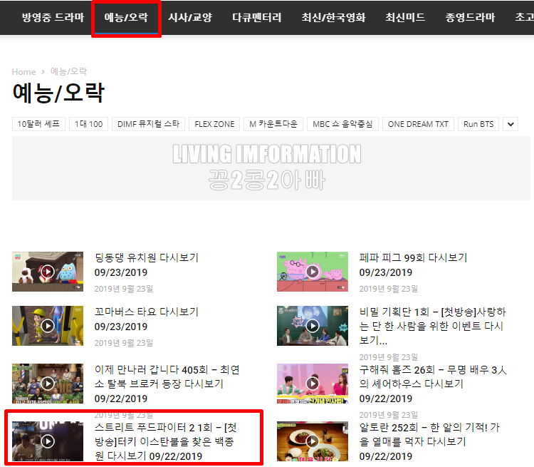 해당 사이트로 접속하시면 메인 화면에 예능/오락 메뉴가 보입니다. 이 예능/오락 메뉴를 눌러서 들어가면 현재 방송중은 예능 프로그램들이 업데이트 되어 있습니다.