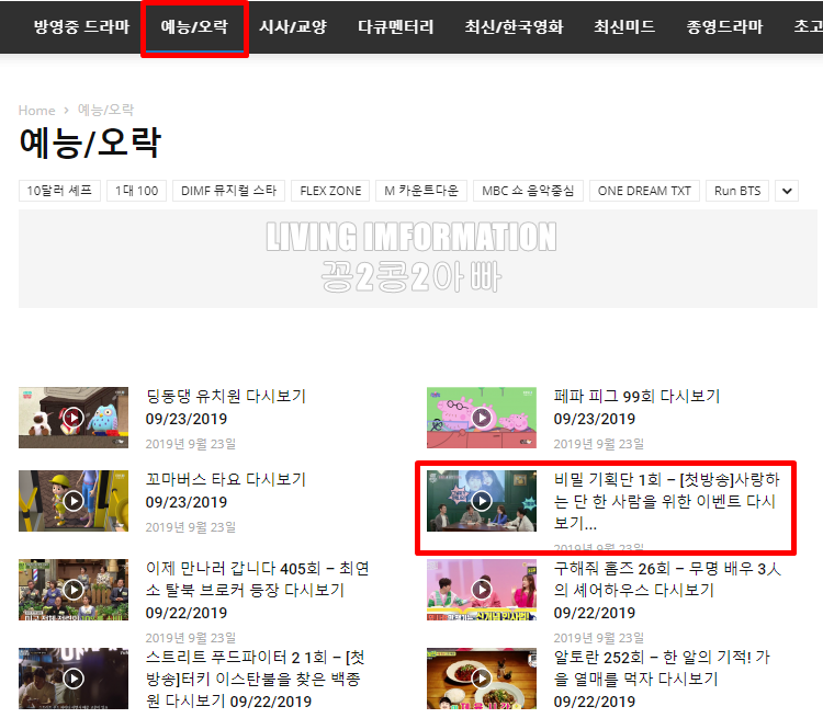 해당 사이트로 접속하시면 메인 화면에 예능/오락 메뉴가 보입니다. 이 예능/오락 메뉴를 눌러서 들어가면 현재 방송중은 예능 프로그램들이 업데이트 되어 있습니다.
