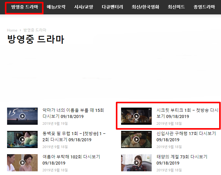 본 사이트로 접속하면, 방영중 드라마 메뉴가 있습니다. 방영중 드라마 메뉴로 들어가면 현재 방송되고 있는 드라마들이 업데이트 되어 있습니다.