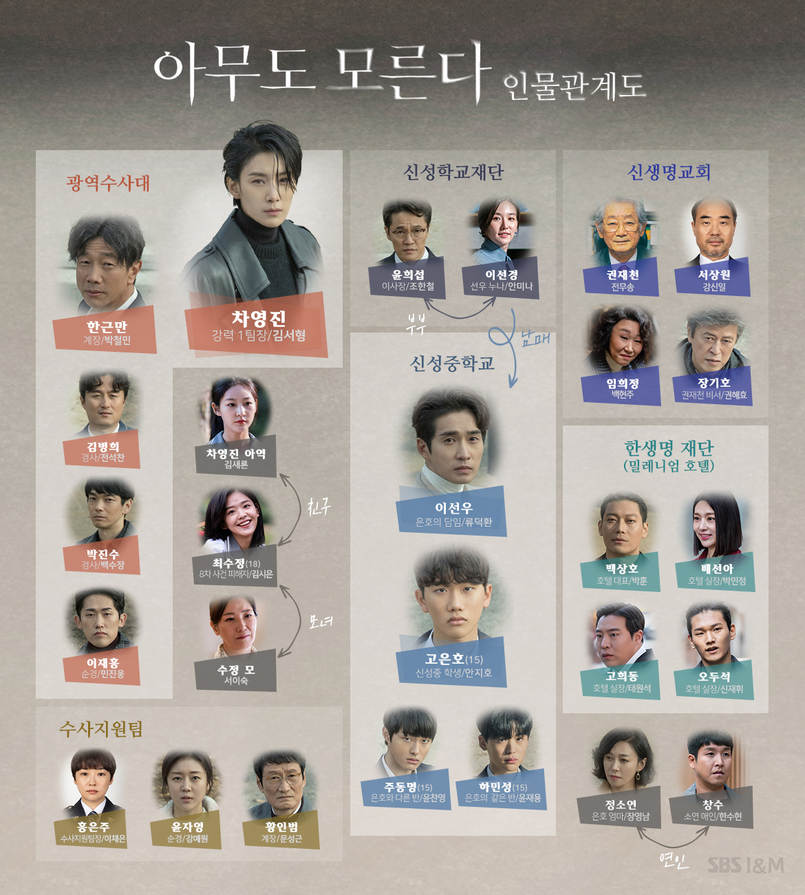 극중 광역수사대 1팀 팀장 김서형은 박철민(한근만 역), 전석찬(김병희 역), 백수장(박진수 역), 민진웅(이재홍 역)가 한 팀으로 호흡을 맞추고, 여기에 문성근(항인범 역), 강예원(윤자영 역) 등이 또 다른 경찰로서 극중 김서형을 돕습니다. 이어 김서형의 19년 전 아픔과 연관된 차영진 아역의 김새론, 친구 김시은(최수정 역)도 있습니다.
