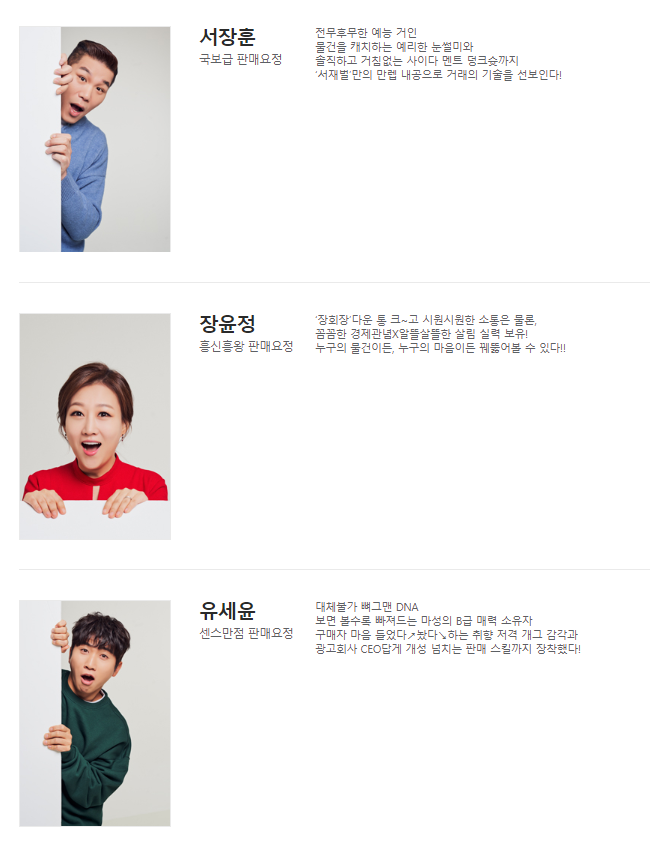 프로그램의 MC로는 서장훈, 장윤정, 유세윤이 맡았는데요. 이른바 ‘서재벌’ 서장훈은 거래의 달인다운 면모로 완벽한 협상의 기술을 선보일 예정. ‘장회장’ 장윤정은 ‘걸어 다니는 대기업’이라는 별명다운 꼼꼼한 경제관념과 살뜰한 살림실력, 그리고 친근한 입담으로 의뢰인과 거래자의 다리 역할을 합니다. 실제로 광고 회사를 운영 중인 ‘유사장’ 유세윤은 특유의 재치 있고 개성 넘치는 물건 설명으로 구매자의 마음을 사로잡을 것으로 기대를 모으고 있습니다.