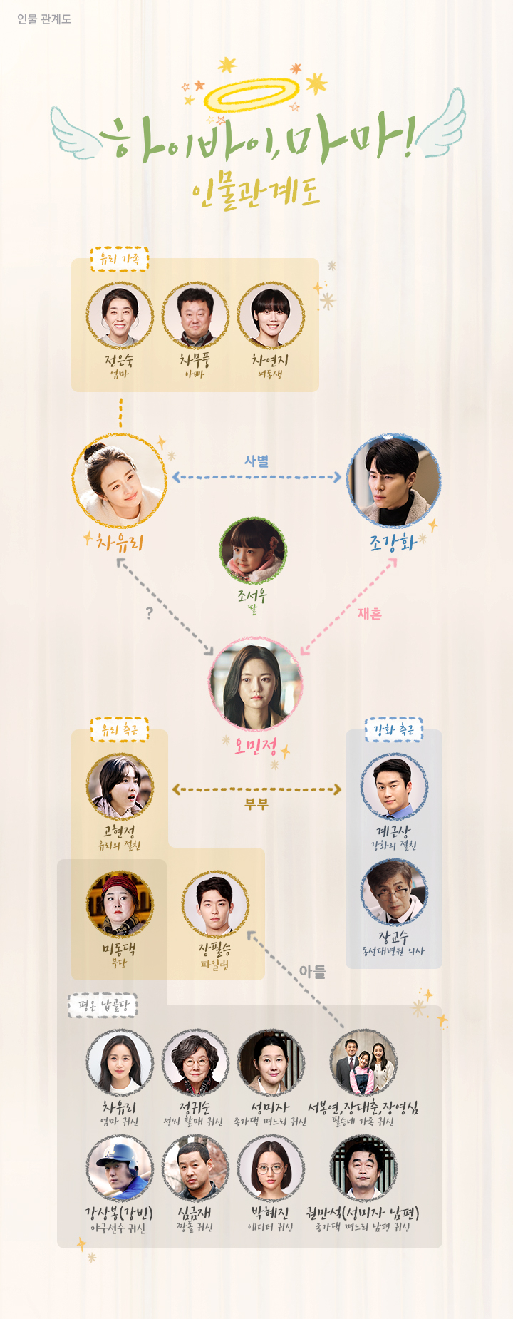 김태희는 아이 한 번 안아보지 못한 아픔에 이승을 떠나지 못하는 고스트 엄마 차유리로 역을 맡았습니다. 이규형은 이별의 슬픔을 딛고 다시 행복해지기 위해 노력하는 흉부외과 의사 조강화역을 맡았습니다. 하늘에서 받아야 할 환생 재판을 뜻밖에도 이승에서 받게 된 차유리를 마주한 조강화는 인생에 또 다른 변화를 맞게 되는데요. 차유리와 조강화의 특별한 재회가 어떤 유쾌한 웃음과 따스한 감동을 선사할지 기대를 모으고 있습니다.